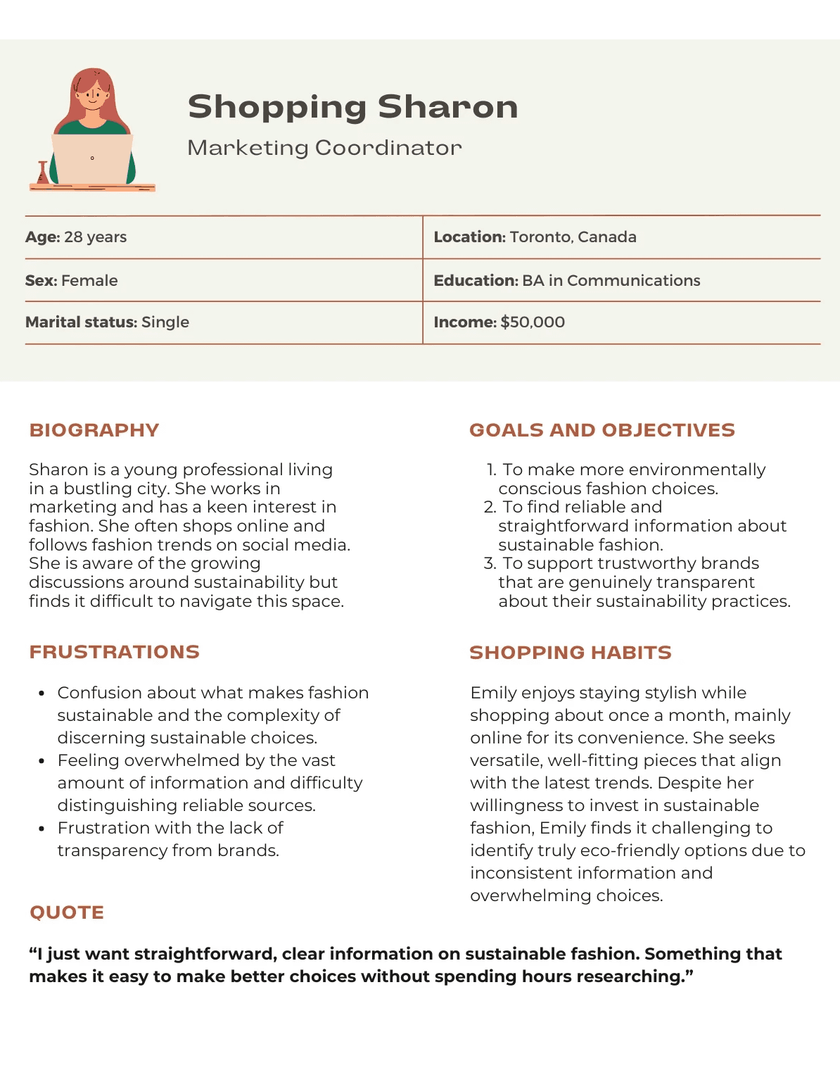 Based on insights from our research, we created our persona to better understand the goals, needs and obstacles of our target users. Meet Shopping Sharon: